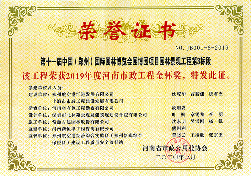 鄭州園博園榮獲2019年度河南市政工程金杯獎