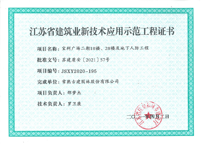 寶利廣場二期及地下人防工程獲江蘇省建筑業(yè)新技術(shù)應(yīng)用示范工程證書