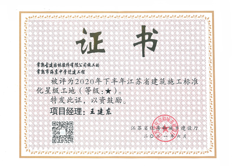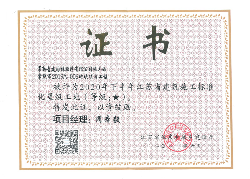 常熟市2019A-006地塊項目工程評獲2020年下半年江蘇省建筑施工標準化星級工地