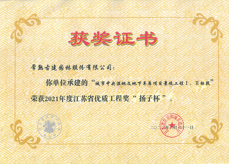 城市中央濕地及地下車庫項目榮獲2021年度江蘇省質(zhì)工程獎"揚子杯"