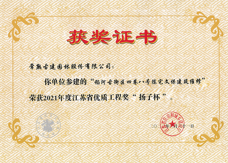 稻河古街區(qū)四巷八號陳宅文保建筑維修榮獲2021年度江蘇省優(yōu)質(zhì)工程獎“揚子杯”