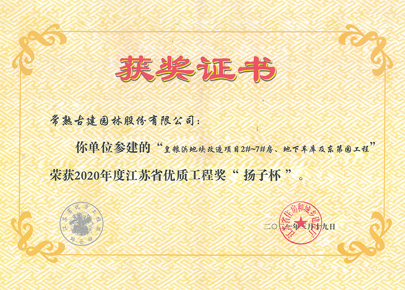 皇糧浜地塊改造項目、地下車庫及東第園工程榮獲2020年度江蘇省“揚子杯”優(yōu)質(zhì)工程獎