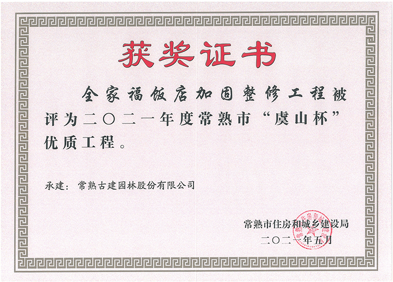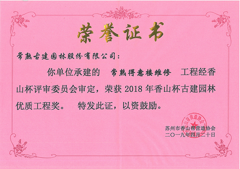 常熟得意樓維修工程榮獲2018年香山杯古建園林優(yōu)質(zhì)工程獎