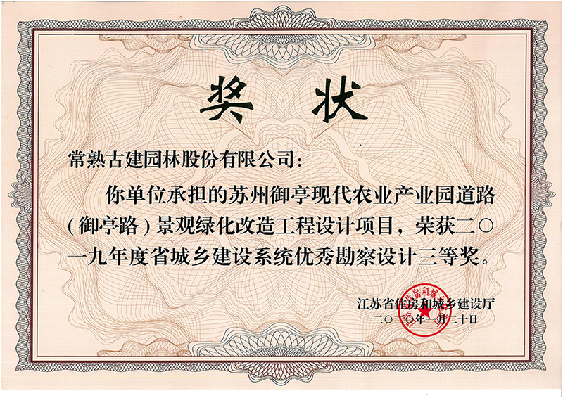 蘇州御亭現(xiàn)代農(nóng)業(yè)產(chǎn)業(yè)園道路(御亭路)景觀綠化改造工程設(shè)計(jì)項(xiàng)目榮獲2019年度省城鄉(xiāng)建設(shè)系統(tǒng)優(yōu)秀勘察設(shè)計(jì)三等獎(jiǎng)