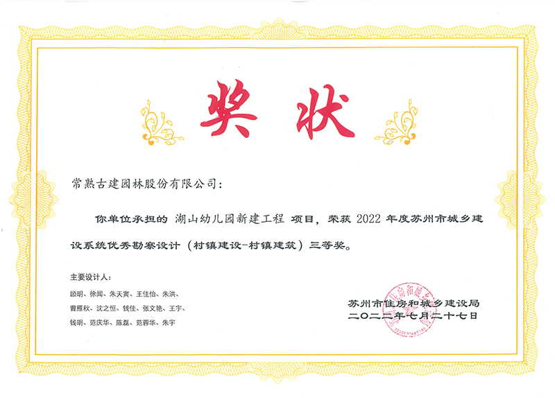 湖山幼兒園新建工程項(xiàng)目榮獲2022年度蘇州市城鄉(xiāng)建設(shè)系統(tǒng)優(yōu)秀勘察設(shè)計(jì)(村鎮(zhèn)建設(shè)-村鎮(zhèn)建筑)三等獎(jiǎng)