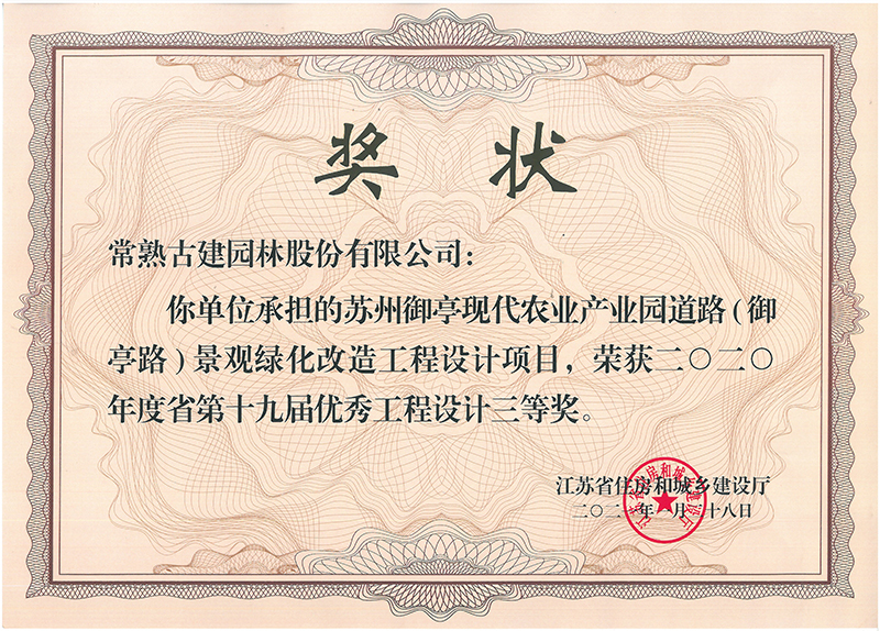 蘇州御亭現(xiàn)代農(nóng)業(yè)產(chǎn)業(yè)園道路(御亭路)景觀綠化改造工程設(shè)計(jì)項(xiàng)目榮獲2020年度省第十九屆優(yōu)秀工程設(shè)計(jì)三等獎(jiǎng)