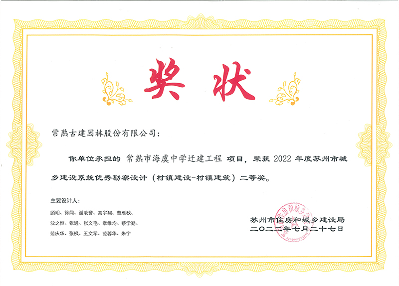海虞中學(xué)遷建工程項(xiàng)目榮獲2022年度蘇州市城鄉(xiāng)建設(shè)系統(tǒng)優(yōu)秀勘察設(shè)計(jì)(村鎮(zhèn)建設(shè)-村鎮(zhèn)建筑)二等獎(jiǎng)
